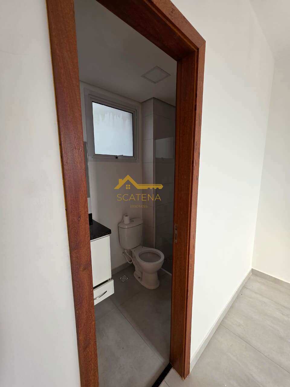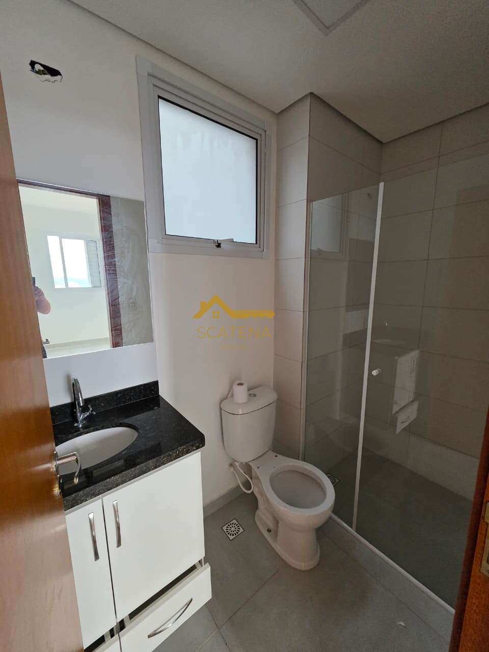 Banheiro com box de vidro e gabinete