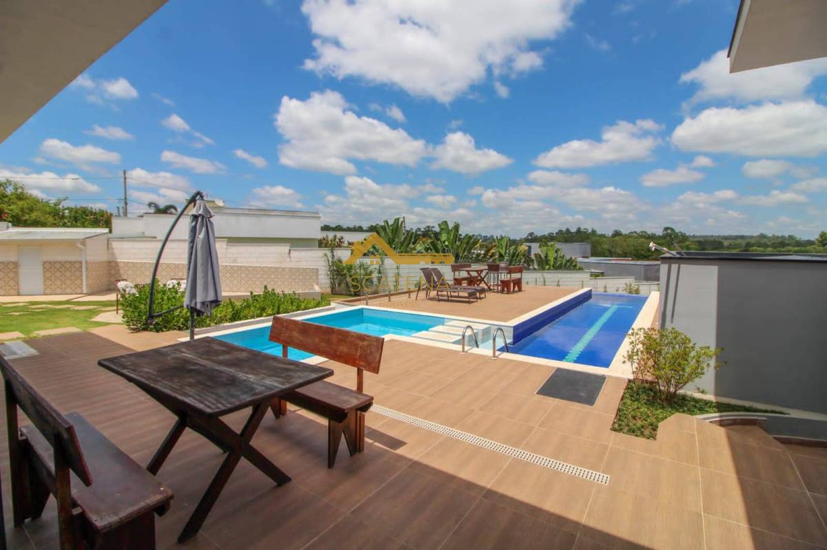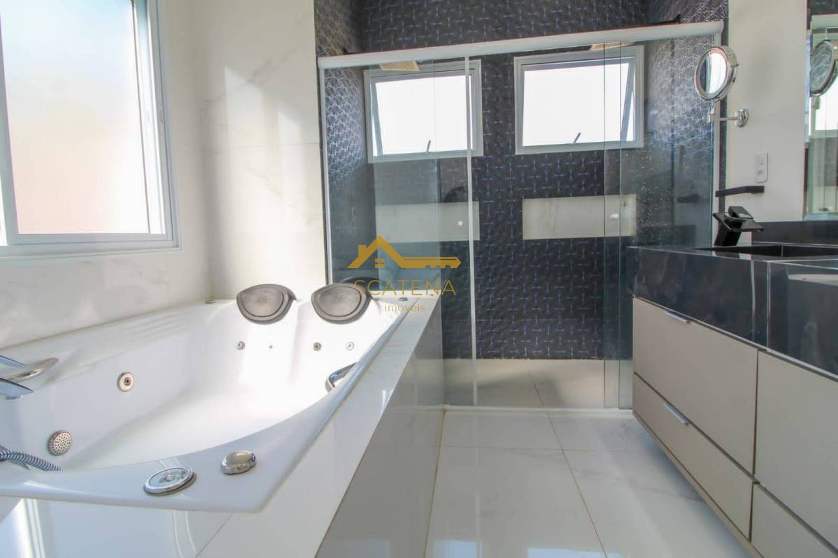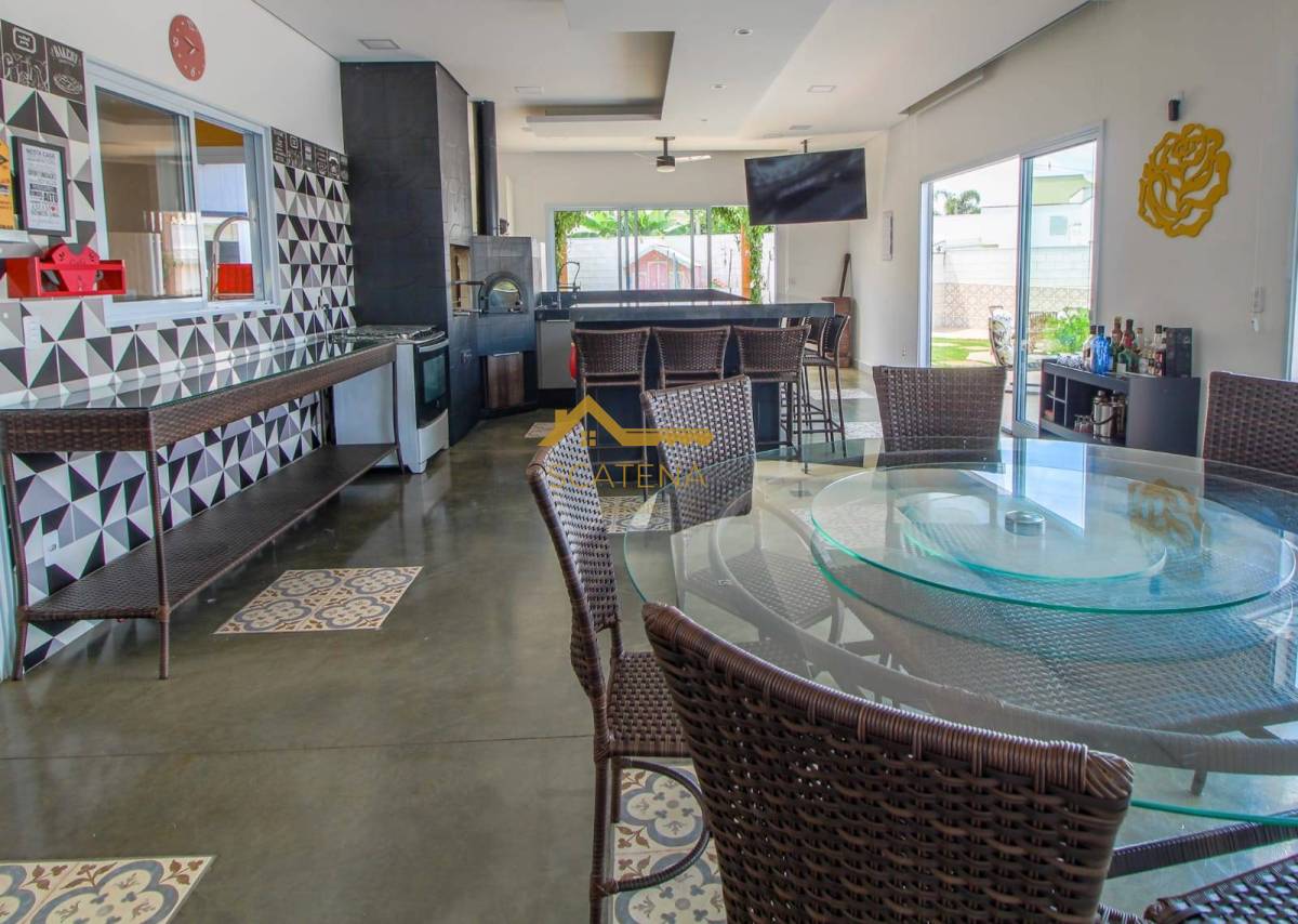 espaço gourmet com churrasqueira, forno de pizza, piscina com raia, 02 WCs, academia, canil, cinema com poltronas e retroprojetor, 04 suítes com ar condicionado, 01 closet na suíte Master (tem 2 chuveiros e banheira), garagem para 2 carros coberta e 4 descobertas, além da extensão de frente da casa que tem 50 metros.