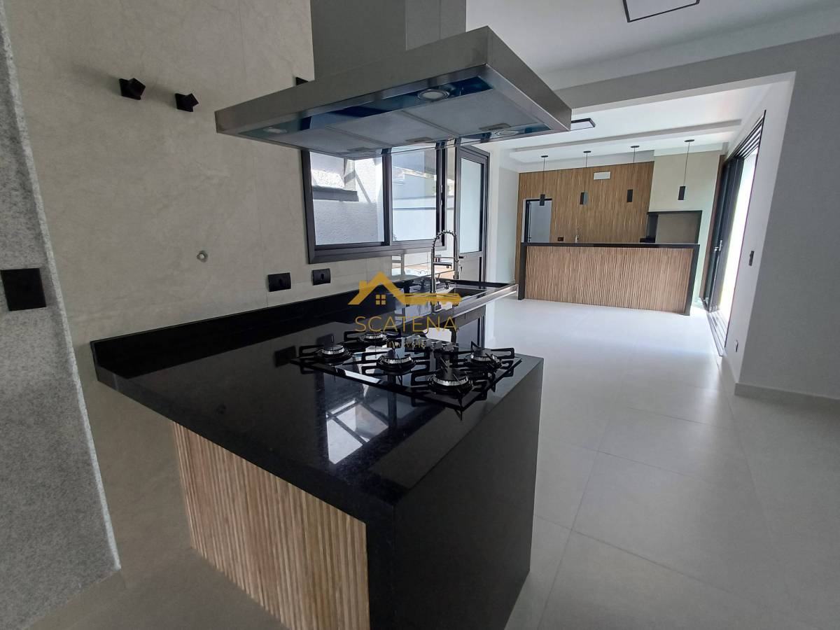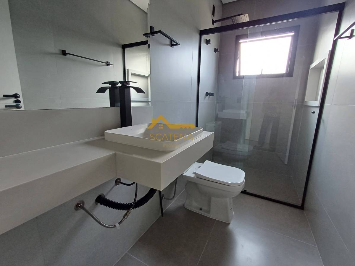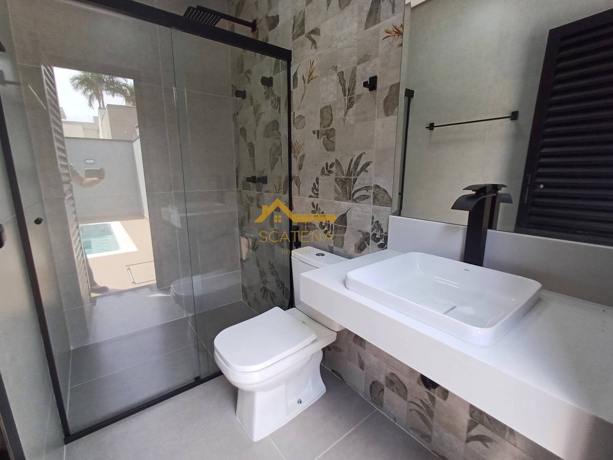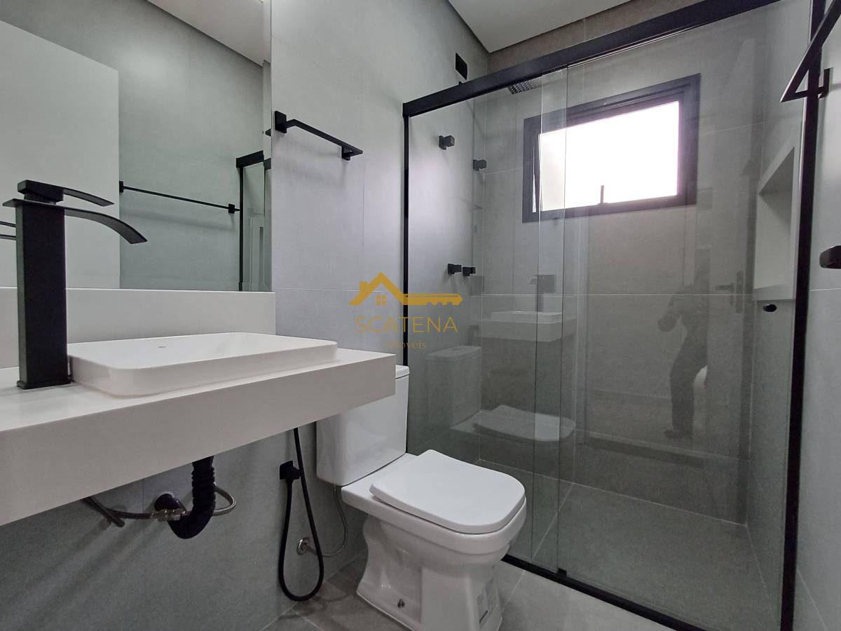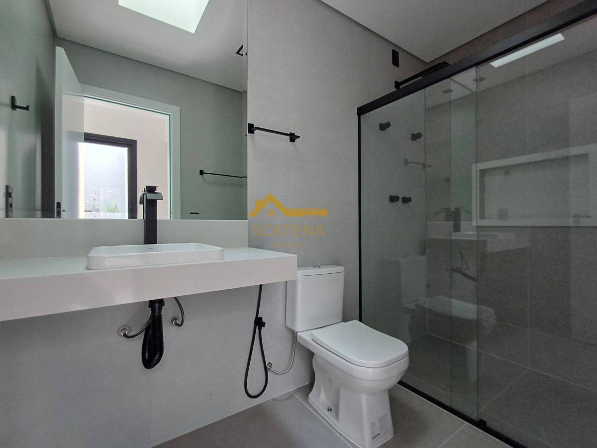 Janelas com persianas automática, energia fotovoltaica, boiler de 500 litros, porcelanato fosco e esquadrias pretas.