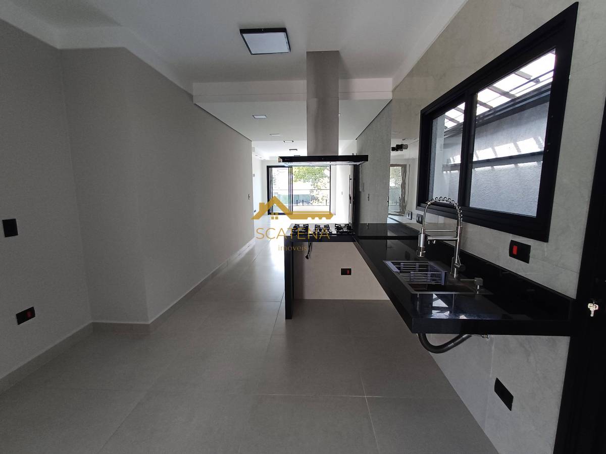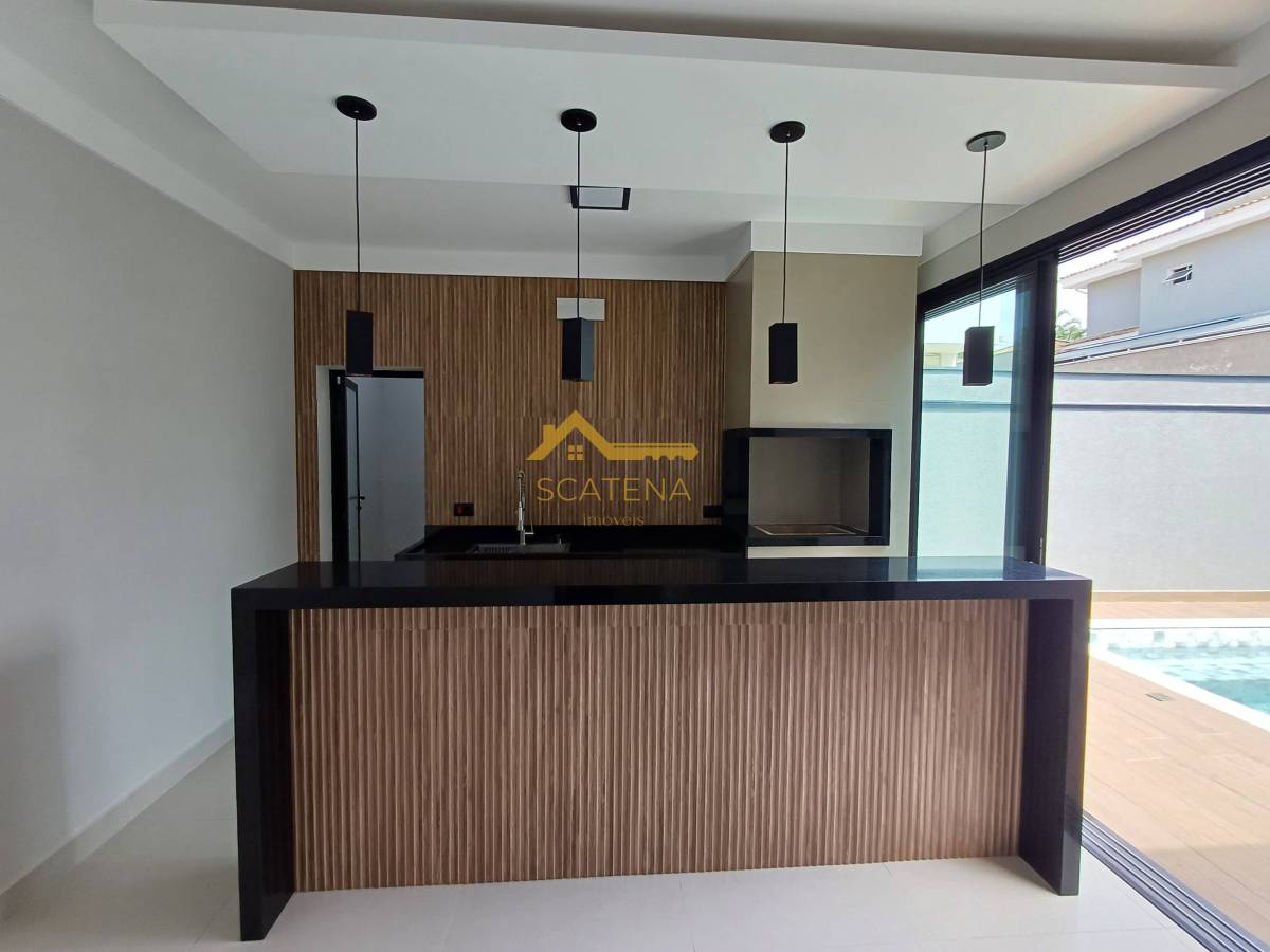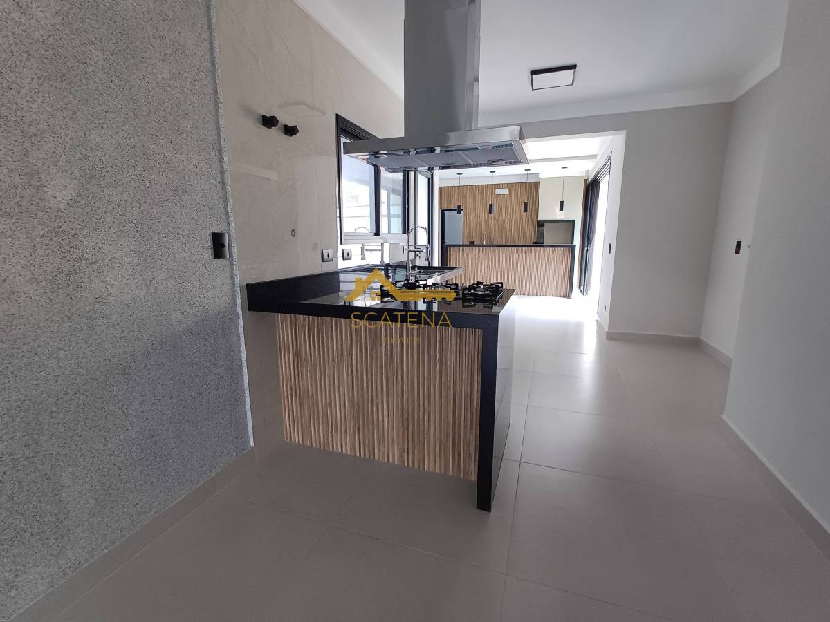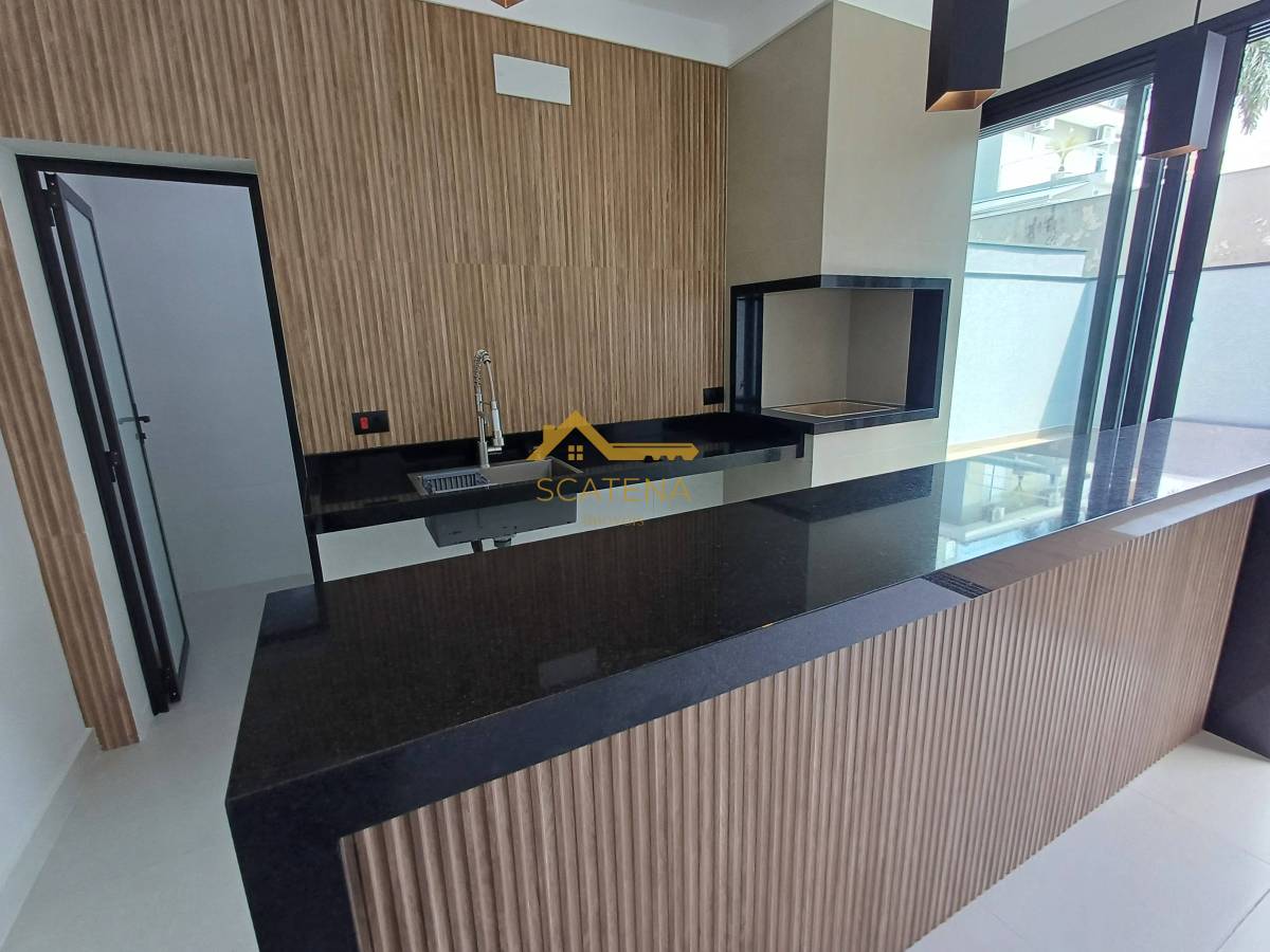 Cozinha com área gourmet equipada com churrasqueira e balcão