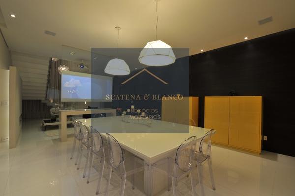 Garagem coberta para 4 carros, garagem inferior com bancada de trabalho com pia e bar pia- depósitos- banheiro funcionário - sistema de som integrado no térreo- telão com projetor de vidros para dois lados e sistema de som integrado no térreo- cisterna para reutilização na descarga e jardim- sistema de câmeras.