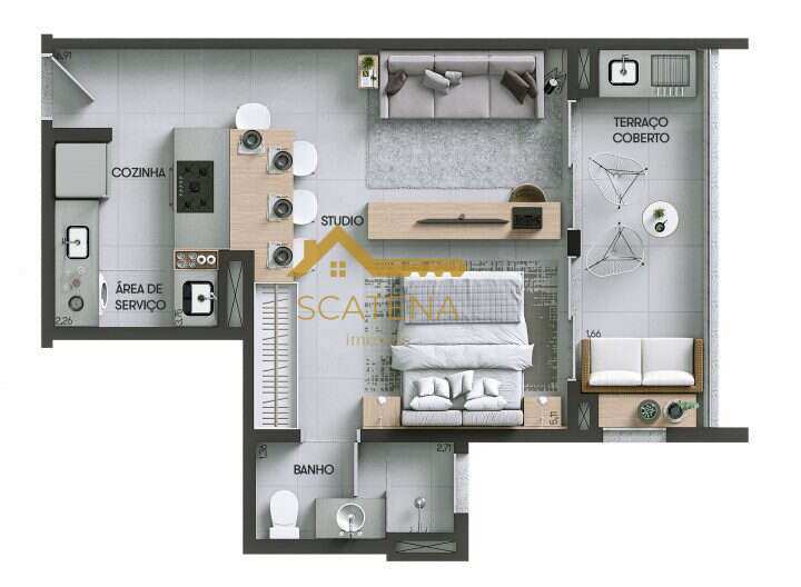 Com 48m², sala integrada à cozinha, lavanderia, 1 dormitório, banheiro e varanda gourmet, 1 vaga de garagem demarcada e depósito privativo;